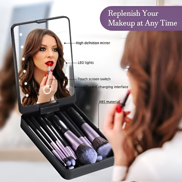 Dzięki temu podróżnemu zestawowi pędzli do makijażu i lusterku LED możesz cieszyć się łatwością nieskazitelnego makijażu, gdziekolwiek jesteś, co czyni go idealnym towarzyszem podróży.
