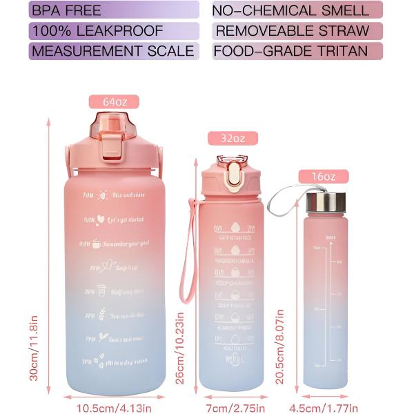 Ten zestaw zawiera trzy bidony na wodę w gradientowych kolorach, z których każda zawiera motywujący cytat z przodu i pomiary objętości z tyłu.