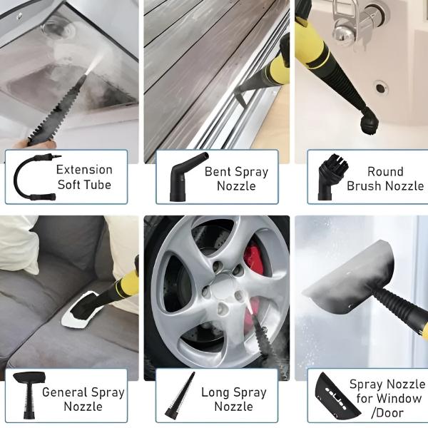 Zawiera szczotki, dysze i nakładki do czyszczenia podłóg, fug, okien i nie tylko.